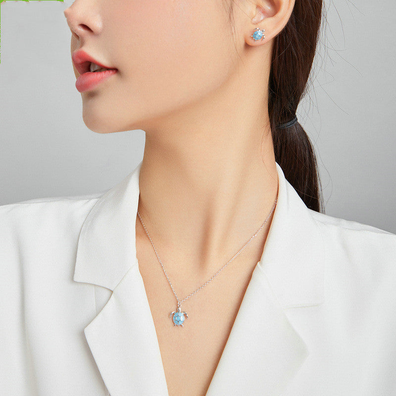 Silvery Blue Turtle 925 Silver Earrings Necklace Set Creative Cute Animal Turtle Jewelry